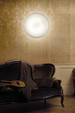 Pod Plafonnier Ou Applique Murale Disque Verre De Murano Incolore Et Dépoli Blanc 43cm