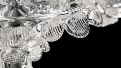 Le lustre chandelier 4604 12 lumières, est entièrement réalisé en cristal de Venise transparent avec une structure en métal chromé. Ce modèle se caractérise par la légèreté de ces décors tout en conservant les attributs du style classique vénitien. Il s’organise en 3 niveaux, dont la partie inférieure est dotée des 12 bras en col de cygne jaillissant d’un vase central, sur lesquelles sont fixées les lumières au bout d’un fourreau en métal chromé, chacun placé sur un bassin en corolle finement sculpté. Chaque détail est délicatement ciselé pour représenter un chandelier floral, telle une luxuriante plante suspendue qui déborde de feuilles cristallines. Le cône de plafond est aussi décoré de petites fleurs de cristal au bout de leurs tiges. D’une remarquable précision et incroyable finesse, ce lustre est un ouvrage de la maison Barovier & Toso, liée à deux familles historiquement impliquées dans le commerce et le travail de verre de Murano depuis le 14ème siècle, verrerie dont la réputation de dimension internationale n’est plus à faire.