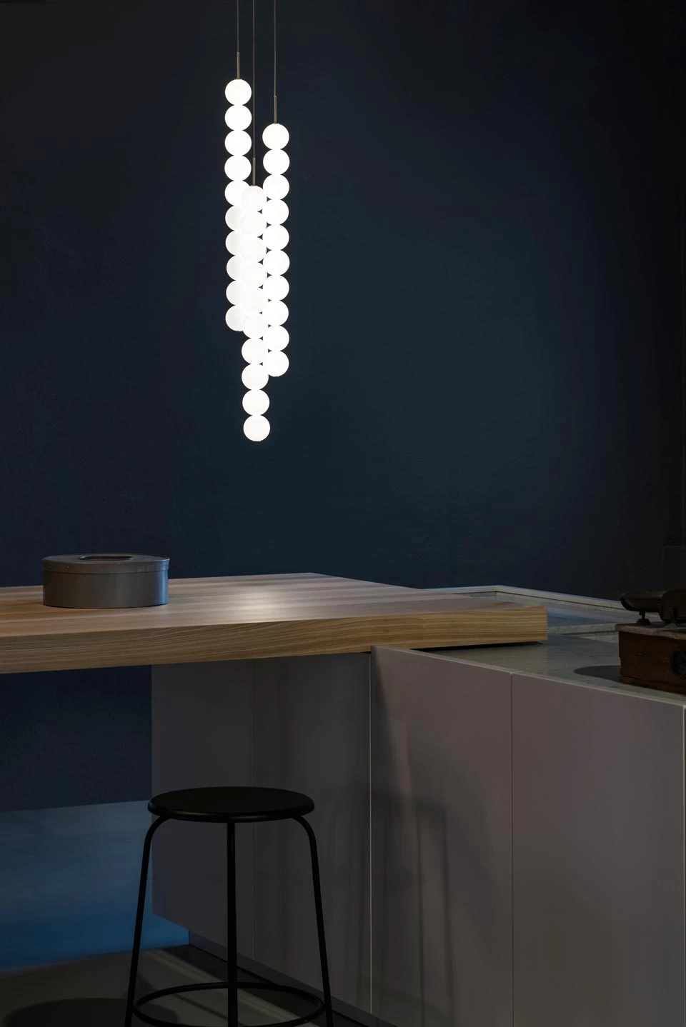 Les suspensions Abacus attirent le regard par leur design contemporain épuré. La suspension triple est composée de 30 boules en verre opale blanc satiné réparties sur 3 câbles métalliques fins, assemblées comme sur un boulier et surmontées d’ une tige en laiton satiné. Les bulles sont en verre opale soufflé bouche selon les techniques artisanales traditionnelles. Les assemblages de boules en verre sont reliés à un cône de plafond hexagonale blanc par un câble en tissu champagne et sont équipés d’un éclairage LED intégré. Un support de plafond en laiton satiné est disponible en option, nous consulter.