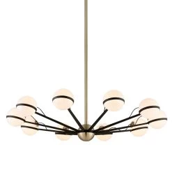 Interprétation contemporaine et épurée d’un style rétro, le lustre Ace donne la sensation du parcours d’une planète autour de son astre. Le lustre est composé d’une tige verticale reliée au plafond, au bout de laquelle est placée une boule centrale ceint d’un anneau étoilé des bras qui soutiennent les diffuseurs à leurs extrémités. La structure est réalisée en fer travaillé à la main, et bénéficie de deux finitions de belle qualité: la tige est en finition laiton brossé qui lui donne ce doré mat, et les bras sont en finition bronze noir. Les diffuseurs en formes de globes de verre opale brillant permettent la diffusion d’une lumière homogène, excellente pour éclairer une tablée ou un bureau. Plusieurs marques sont incluses dans la gamme de luminaire de la maison américaine Hudson Valley, marquée par sa diversité de style.