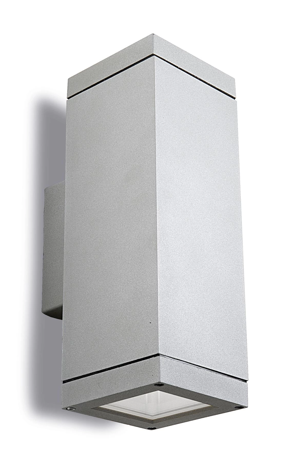 Informations techniques: fabrication en aluminium injecté haute pureté gris et verre trempé. Dimensions: hauteur-longueur 31cm, côté du carré 11cm, profondeur totale (dégagement du mur) 15cm, hauteur de la platine de mur: 12cm. Aux normes pour extérieur IP 65. Source de lumière: 2 ampoules-spot PAR-30 à vis E27, qui peuvent être halogènes (75W maximum), ou à économie d’énergie (15W maximum). Ces ampoules sont à acheter séparément mais se trouvent facilement en grande surface.