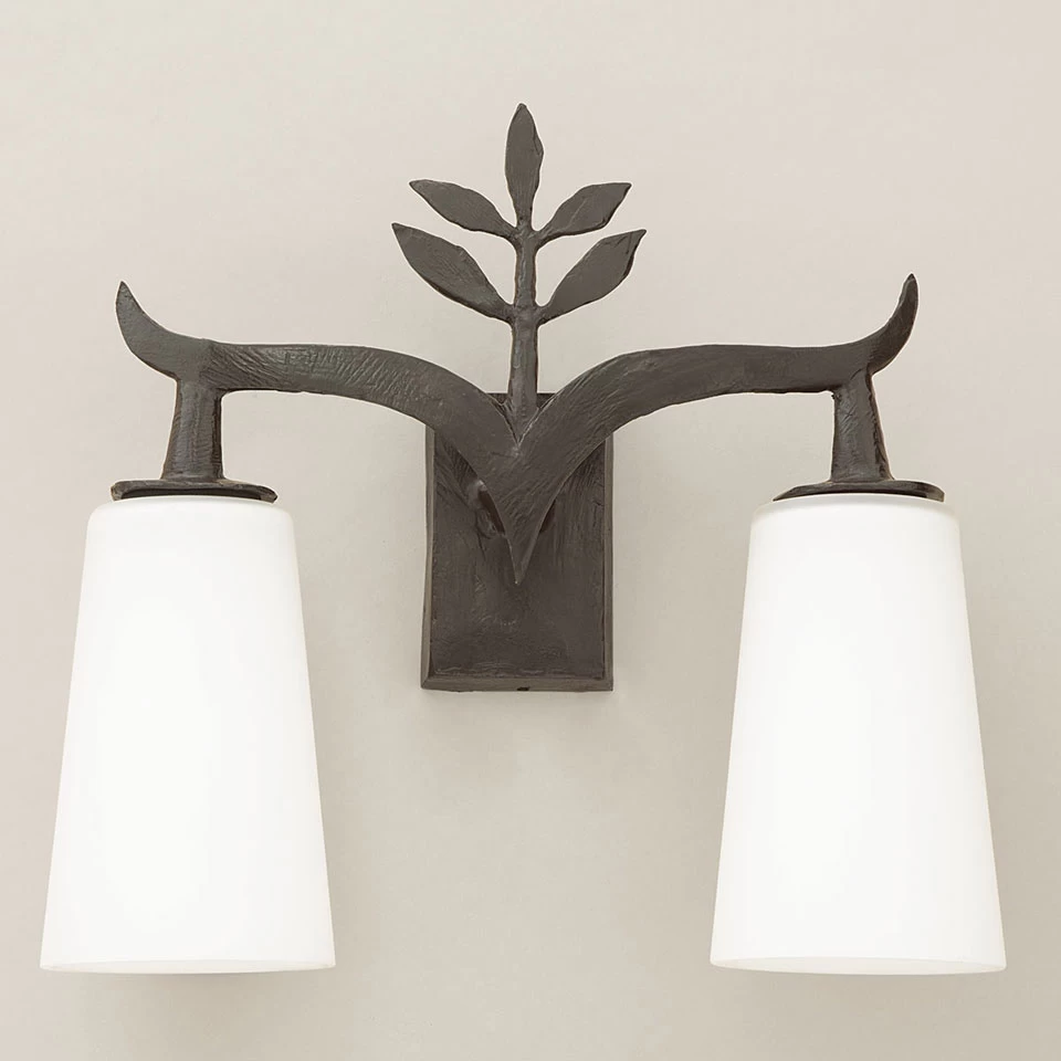 Un design classique et élégant pour cette applique 2 lumières Alia, qui évoque une ambiance antique avec son bronze massif noir patiné et ses petits diffuseurs en verre opale blanc. Le modèle est doté d’un support mural rectangulaire vertical, sur lequel est fixé une pièce en forme d’accolade horizontale, surmontée d’une jeune pousse d’arbre qui donne une touche champêtre au modèle. Les 2 lumières enfin, sont fixé sur les extrémités de l’accolade, les abat-jour sont coniques et allongés en verre blanc. Remarquez le travail du bronze magnifié par la finition brune qui met en valeur la dimensions brute et puissante du matériau. Ce modèle est IP23 pour un usage en extérieur ou dans une salle de bain.