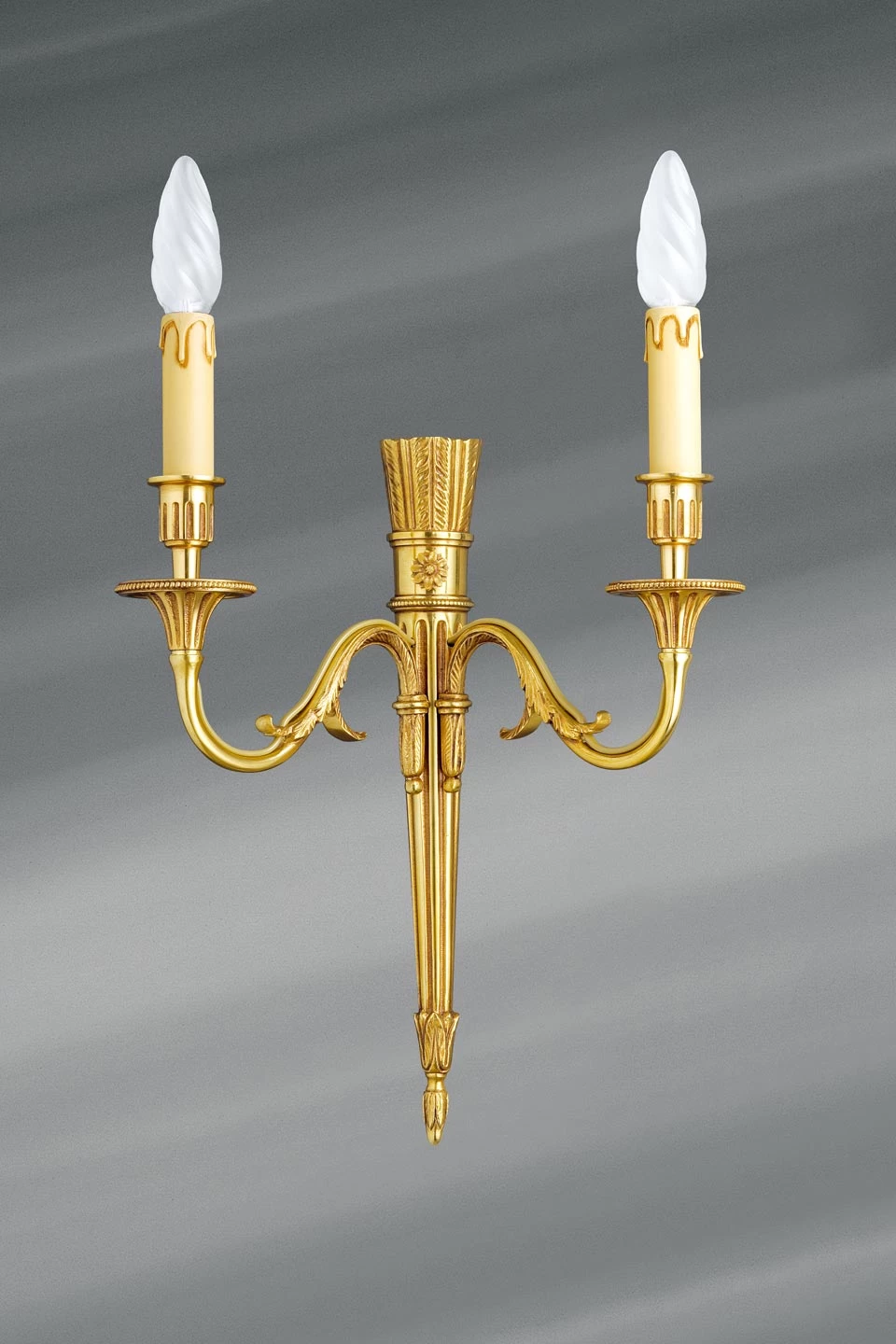 Cette applique murale de style Louis XVI, en bronze massif patiné vieil or, arbore fièrement ses deux bras en double volutes terminés par deux bougeoirs. La qualité et la finesse de son décor composé principalement de feuilles d’acanthe, de colliers de perles fines et de cannelures est obtenue par le coulage du bronze massif dans un moule au sable qui ne servira qu’une fois. L’usage unique de ce moule et l’exceptionnel savoir faire des artisans de la maison Lucien Gau, fournisseur officiel des monuments historiques français, confère à ce bougeoir une précision de décor unique. Admirons aussi le relief du feuillage de la partie haute du bougeoir et de la fleur sur la bague qui le soutent. Assortit à cette applique, il existe un lustre à six lumières visible sous la référence 16060041.