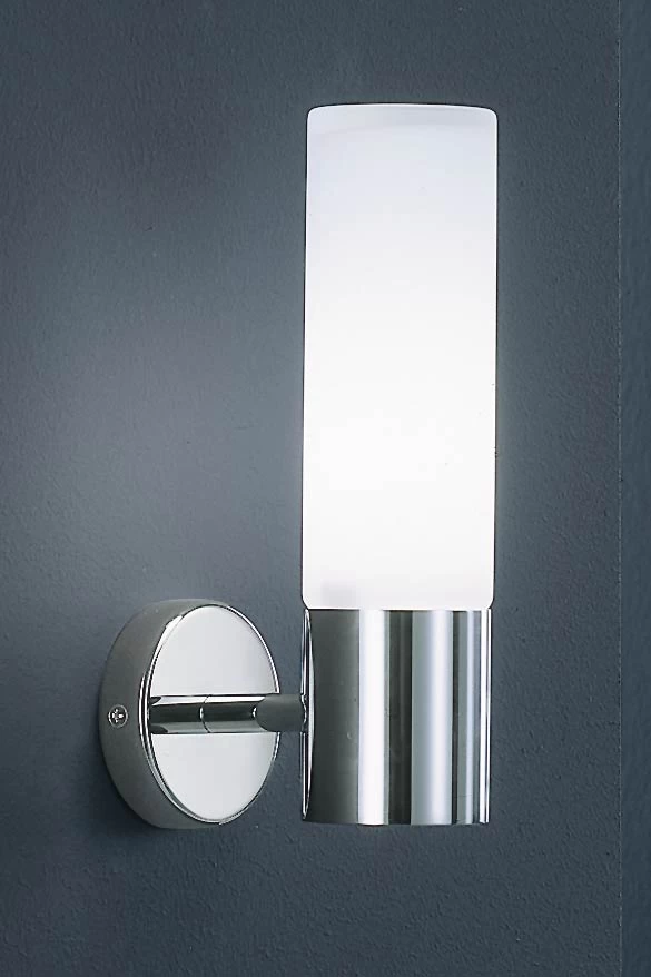 Chromée, cette applique de salle de bains est constituée d’un support mural en forme de disque, prolongé par un fin bras horizontal en tige. Cylindrique, l’élément vertical de cette applique se décompose entre une partie inférieure en métal chromé, et une partie supérieure constituant le diffuseur en verre dépoli. Le diffuseur abrite une ampoule fluocompacte. La lumière est vive et précise. Fabrication particulièrement soignée dans les ateliers de Baulmann Leuchten en Allemagne. Etanche norme IP44.