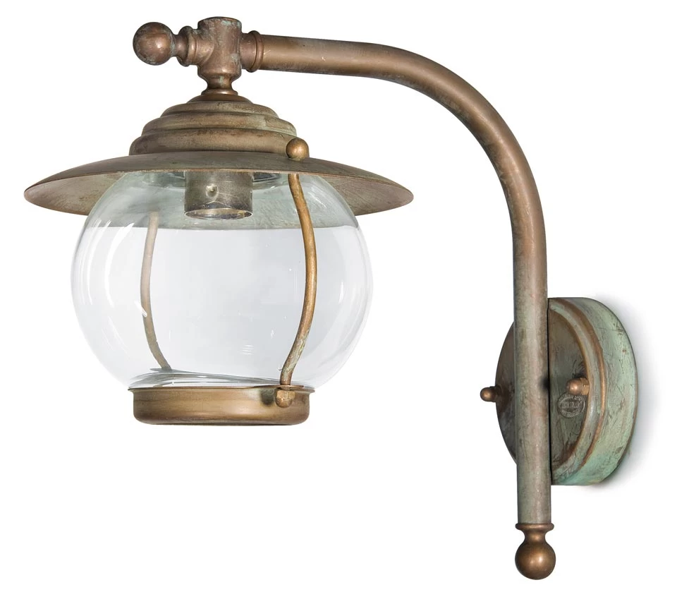 Un très beau travail pour cette applique en laiton vieilli de la gamme Marine. Elle est munie d’une coupole en laiton protégeant un globe rond en verre transparent suspendue à une tige courbe. Le support mural en laiton également est de forme circulaire. Ce modèle est conforme à la norme de protection IP44 et ne craint pas la corrosion due au sel. La fabrication en laiton massif d’excellente qualité, est effectuée dans les ateliers de Moretti Luce, en Italie. Existe aussi en applique réf.15090430, en suspension réf.15090432 et lampadaire réf.1509433.
