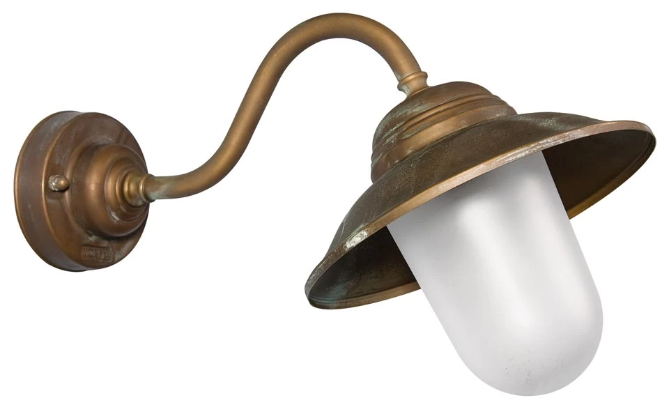 Classique, cette applique d’extérieur est en laiton vieilli. Sa tige est courbe en col de cygne prolongée par une coupole en forme de cloche avec éclairage oblique. L’ampoule est protégée par un verre blanc opale. Le support mural est en laiton également et de forme circulaire. Ce modèle est conforme à la norme de protection IP44 et ne craint pas la corrosion due au sel. Sobre, elle peut également être installée à l’intérieur de la maison à la campagne ou au bord de la mer. La fabrication en laiton massif d’excellente qualité est effectuée dans les ateliers de Moretti Luce, en Italie. Existe aussi avec éclairage droit réf. 15090405 et en plafonnier tige longue réf.15090408.