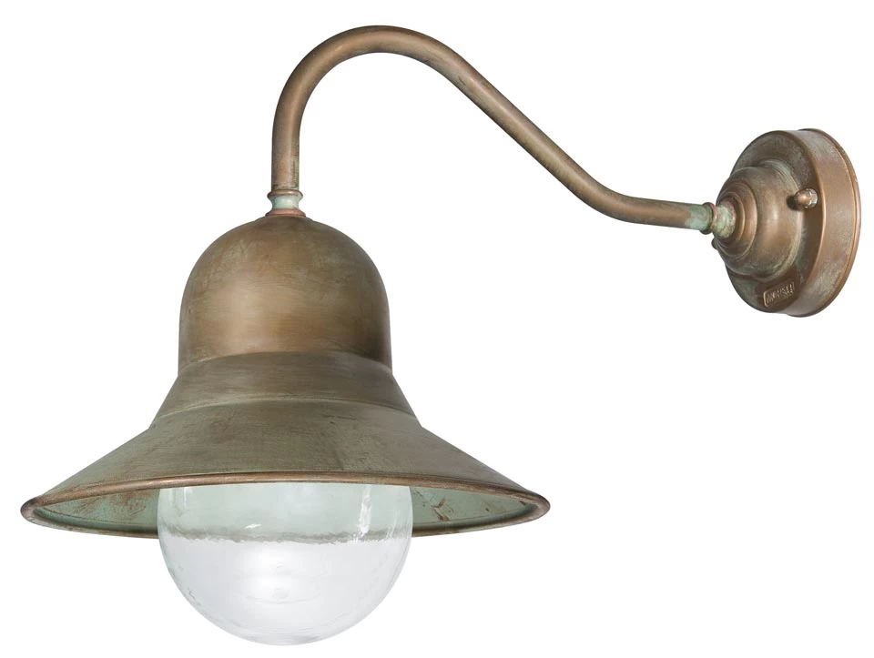 Très belle réalisation pour cette applique en forme de cloche en laiton vieilli. Elle présente une tige en forme de col de cygne. Elle est munie d’un chapeau en laiton protégeant un verre transparent qui renferme l’ampoule. Son support mural est également en laiton. Ce modèle est conforme à la norme de protection IP44 et ne craint pas la corrosion due au sel. La fabrication en laiton massif d’excellente qualité, est effectuée dans les ateliers de Moretti Luce, en Italie. Existe aussi en applique avec tige courbe courte réf.15090434, applique tige courbe réf.15090435, en suspension chaine réf.1509437 et en plafonnier réf.1509438.