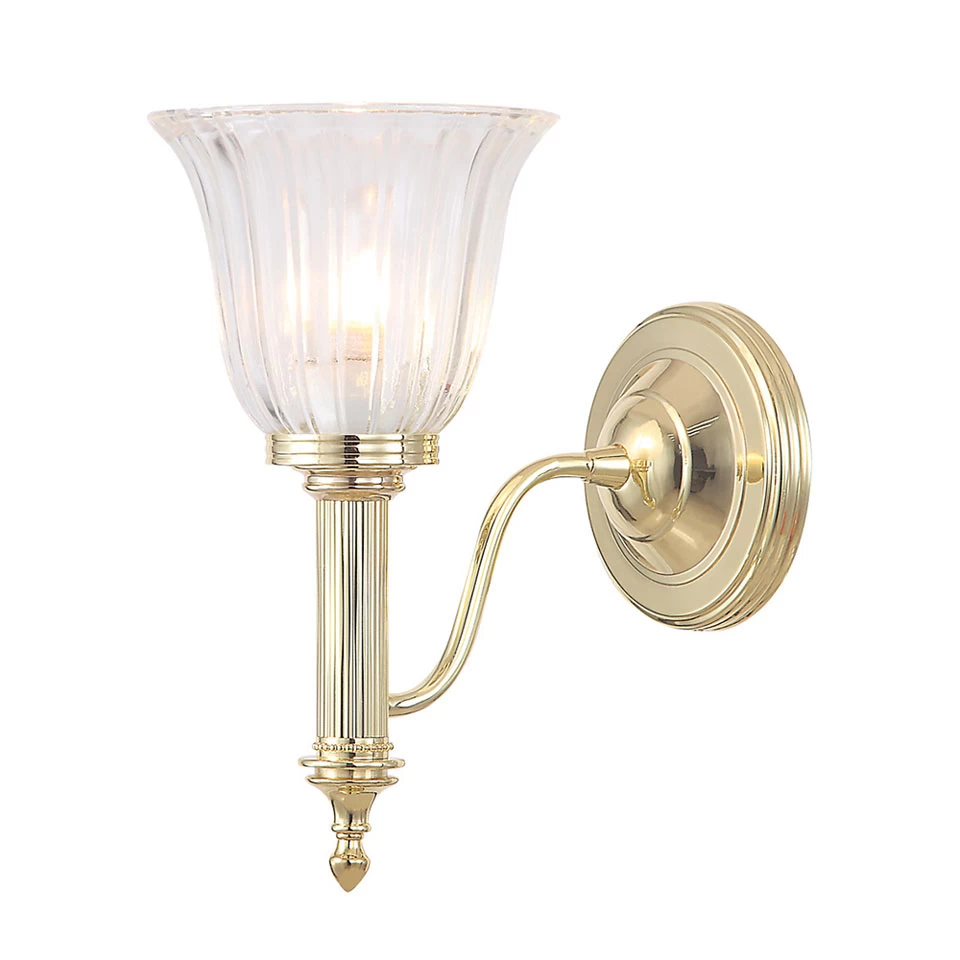 Sur cette page figure une applique en laiton doré et verre cannelé Carroll 1, destinée à la salle de bain. Elle est constituée d’un support mural cylindrique et d’un bras, et d’une délicate fleur de verre. Le laiton est poli pour donné une finition lisse et dorée. Cette applique possède un indice de protection IP44 conforme à l’usage en salle de bain ou autre milieu humide. Elstead lighting est une entreprise anglaise héritée d’une forge en activité depuis le XVIIème siècle. Aujourd’hui spécialisée dans la lumière, la marque propose une production éclectique de luminaires d’intérieurs et d’extérieurs. Cette applique existe également en finition chromée sous la référence 12110118.