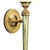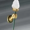La finition or vif et vert empire, donne à cette applique en bronze massif de style Empire, agrémentée de trois cygnes conquérants portant lumières, une fraîcheur particulière. La finition or vif donne une vision simplifiée du décor pourtant très travaillé. C’est l’aspect général de cette applique qui est appréhendé. La partie centrale et murale, laquée en vert empire, est composée dune pièce quasiment rectangulaire terminée en ses deux extrémités par un éventail de plumes. Au centre de l’applique, admirons un élément de décor d’une grande beauté, orné de flammes auquel sont fixés les cygnes triomphants portant lumières. La tête de chaque oiseau est surmontée d’une bobèche et d’une bougie. L’ensemble est parfait. Réalisé avec une totale maîtrise. Cette perfection est le fruit du travail et de l’expertise des artisans d’art de la maison Lucien Gau, détentrice d’un savoir faire séculaire, vieux de plus de six générations. Cette très belle applique est également disponible dans une version à deux lumières visible sous la référence 16060114 ou à simple lumière, visible sous la référence 16060110 et peut être complété par un lustre à sept lumières, visible sous la référence 16060106.