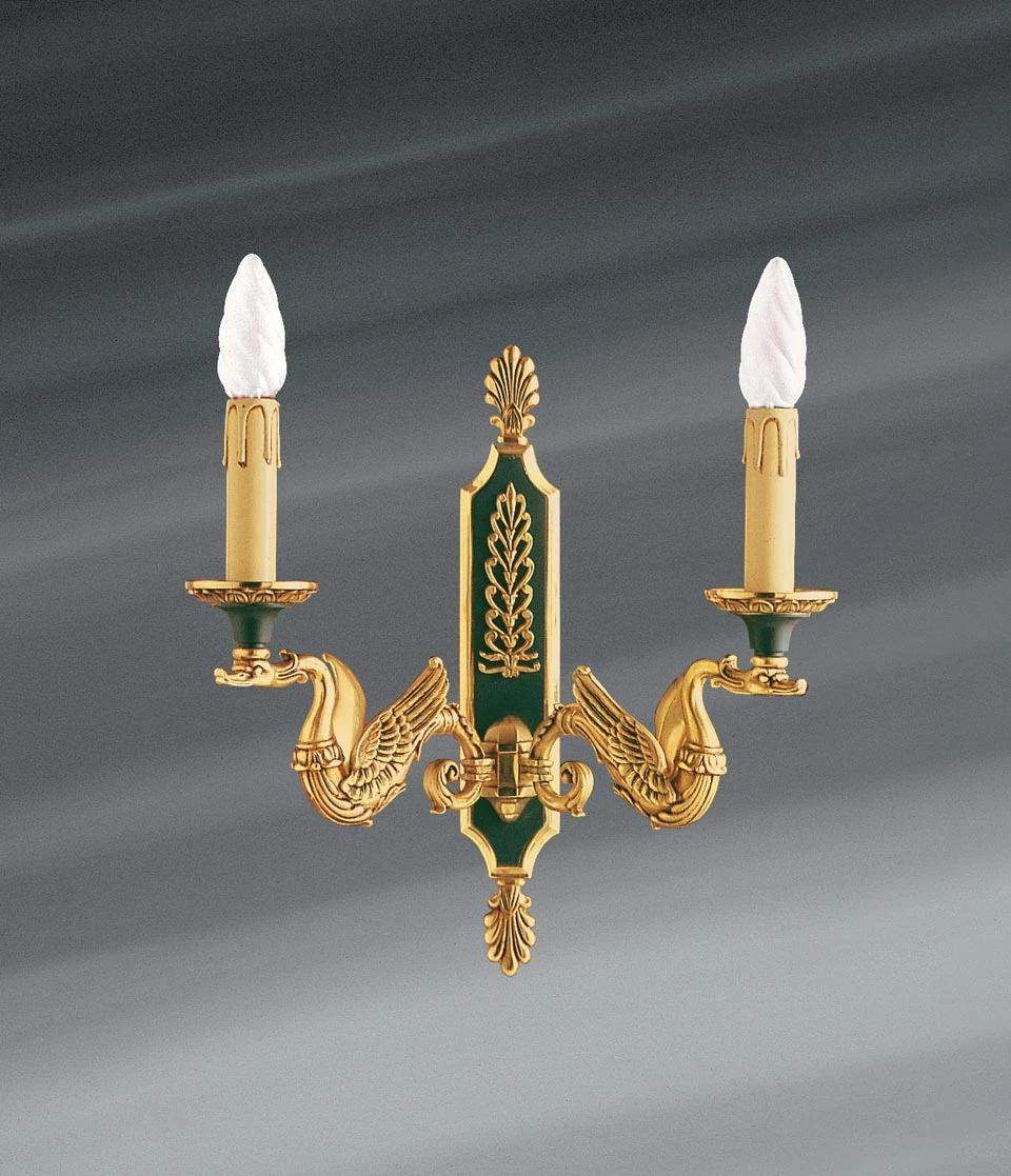Cette applique double en bronze massif de style empire est d’une grande beauté et d’un parfait équilibre. Ornée de deux cygnes portant fièrement lumières, cette applique voit la qualité de son décor mis en valeur par la finition vieil or et vert empire du bronze qui la compose. La partie centrale et murale est plate, surmontée et terminée par un décor de feuilles de palme en éventail. Sur sa partie centrale, un décor doré de feuilles recourbées est mis en valeur par le laquage vert du fond du cadre. Sur la partie basse de l’applique est fixée une attache d’où partent les deux cygnes portant lumières. Les bobèches et bougies sont supportées par la tête des cygnes. La qualité du bronze utilisé et la réalisation des décors est absolument parfaite. Elle est la signature de l’expertise des artisans d’art de la maison Lucien Gau, fournisseurs officiels des châteaux et monuments historiques français ainsi que des plus beaux hôtels de ce monde. Également disponible dans la même facture, une applique à cinq lumières sur deux niveaux visible sous la référence 16060107 et un lustre à sept lumières visible sous la référence 16060106.