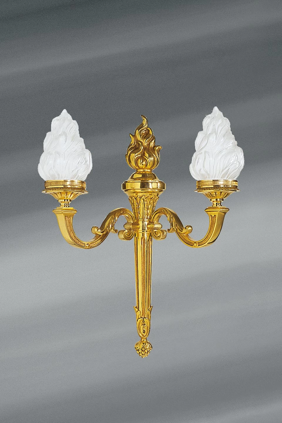 Généreuse, cette applique double de style Louis XVI, en bronze massif patinée en vieil or, est ornée de bras en volute recouverts de feuilles recourbées et terminés par un motif géométrique portant bassin. Les bassins commencent par une partie très évasée pour se poursuivre par une partie cylindrique sur laquelle se succède des cercles striés, polis et martelées et accueille une verrerie blanche dépolie représentant une flamme. Le corps de l’applique est légèrement évasé. Sa partie principale est cannelée, terminée en ses deux extrémités par des éléments floraux, caractéristique du style Louis XVI. Les feuilles d’acanthes s’élançant vers le haut supportent un large cercle qui fait échos à celui des bassins. L’applique se termine par une flamme généreuse et voluptueuse qui lui donne toute sa personnalité. La fabrication est d’une qualité remarquable. Moulée au sable, les assemblages, finition et décoration sont entièrement manuelles, réalisées avec expertise par les artisans d’art de la Maison Lucien Gau, fournisseur officiel des monuments historiques français.