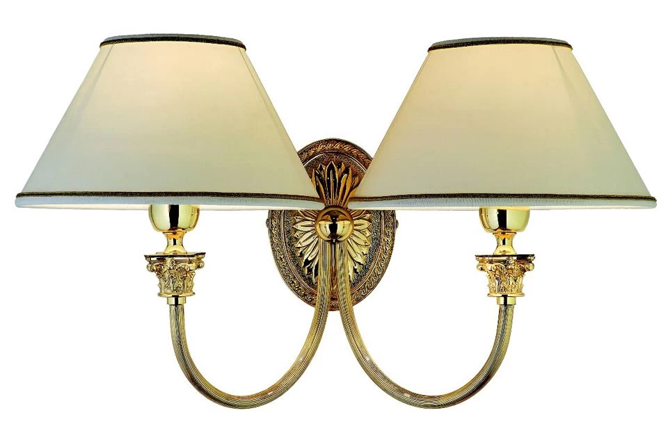 Applique double posĂ©e sur un socle ovale ornementĂ© de torsades munie de deux tiges courbes avec feuilles type corinthien coiffĂ©es d’abat-jour en tissu plissĂ© entourĂ©s de deux galons très fins dorĂ©s. Cette applique murale, de la collection classique Principe, est Ă©ditĂ©e par la marque italienne de luminaire de luxe Estro. Estro est une marque reconnue mondialement pour l’excellence de son travail. Estro allie classicisme, esthĂ©tique et une grande innovation dans le choix et la finesse des matĂ©riaux utilisĂ©s. Cette applique double tiges existe aussi en version simple. Dans la mĂŞme collection, Ă dĂ©couvrir des appliques murales sur socle rectangle en version simple ou double tiges rĂ©fĂ©rence 13090009.