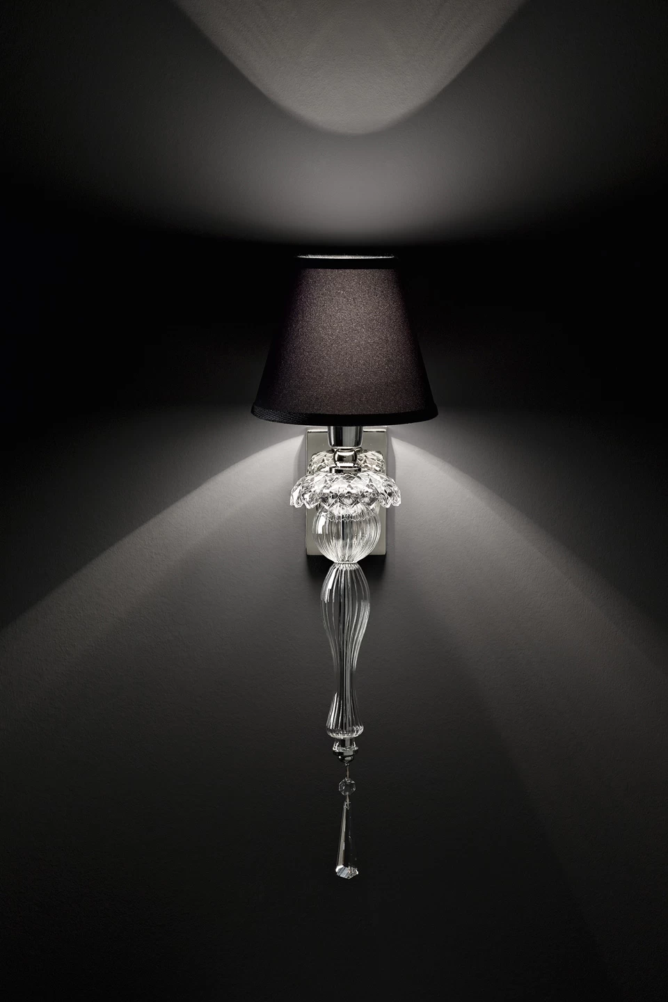 Cette élégante applique pour la salle de bain est constitué d’un corps en verre strié, surmonté d’une décoration en cristal sculpté et d’une pampille goutte d’eau en Strass. Elle possède un indice de protection IP44. Le Strass véritable est facilement reconnaissable aux multiples facettes taillées et à l’éclat particulier de la lumière qui le traverse. Le support mural rectangulaire et toute la structure sont en nickel brillant et l’abat-jour conique est noir. Un autre modèle avec plusieurs pampilles et un abat-jour blanc est visible sous la référence 18050085 et ce même modèle, non équipé d’une protection IP44 pour la salle de bain sous la référence 18050017. Cette applique est entièrement fabriqué à la main par des maîtres verriers en Italie.
