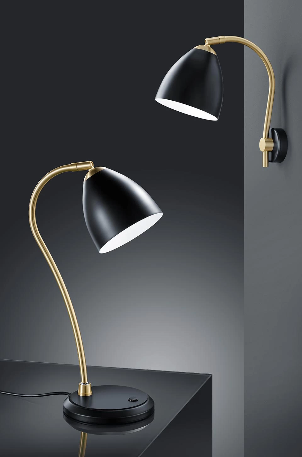 Un très beau travail et un design classique pour cette applique en métal noir mat et laiton satiné. Elle se compose d’une tige courbe en métal doré et d’un abat-jour noir mat. Celui-ci est inclinable et en forme de tulipe et présente un intérieur blanc. Son support mural rond est également en métal noir. Ce luminaire, fabriqué dans les ateliers Baulmann Leuchten en Allemagne bénéficie d’une réalisation très soignée. Orientable à votre guise, elle assurera un éclairage parfait dans votre intérieur et conviendra à tout style.