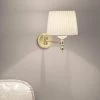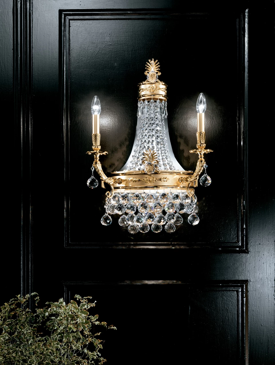 Magnifique applique de forme montgolfière en métal doré et pampilles en cristal. Ce modèle se caractérise par un large bandeau décoré en métal poli et métal satiné et qui supporte 2 lumières. Chaque bras porte bassin et bobèche finement travaillés ainsi qu’un fourreau doré. Les pampilles positionnées sous le bandeau sont de larges gouttes en cristal taillé., celles au dessus sont arrangées en collier. La maison italienne Masiero dont la réputation internationale n’est plus a faire, fait venir les matériaux les plus raffinés pour être façonnés par les meilleurs artisans.