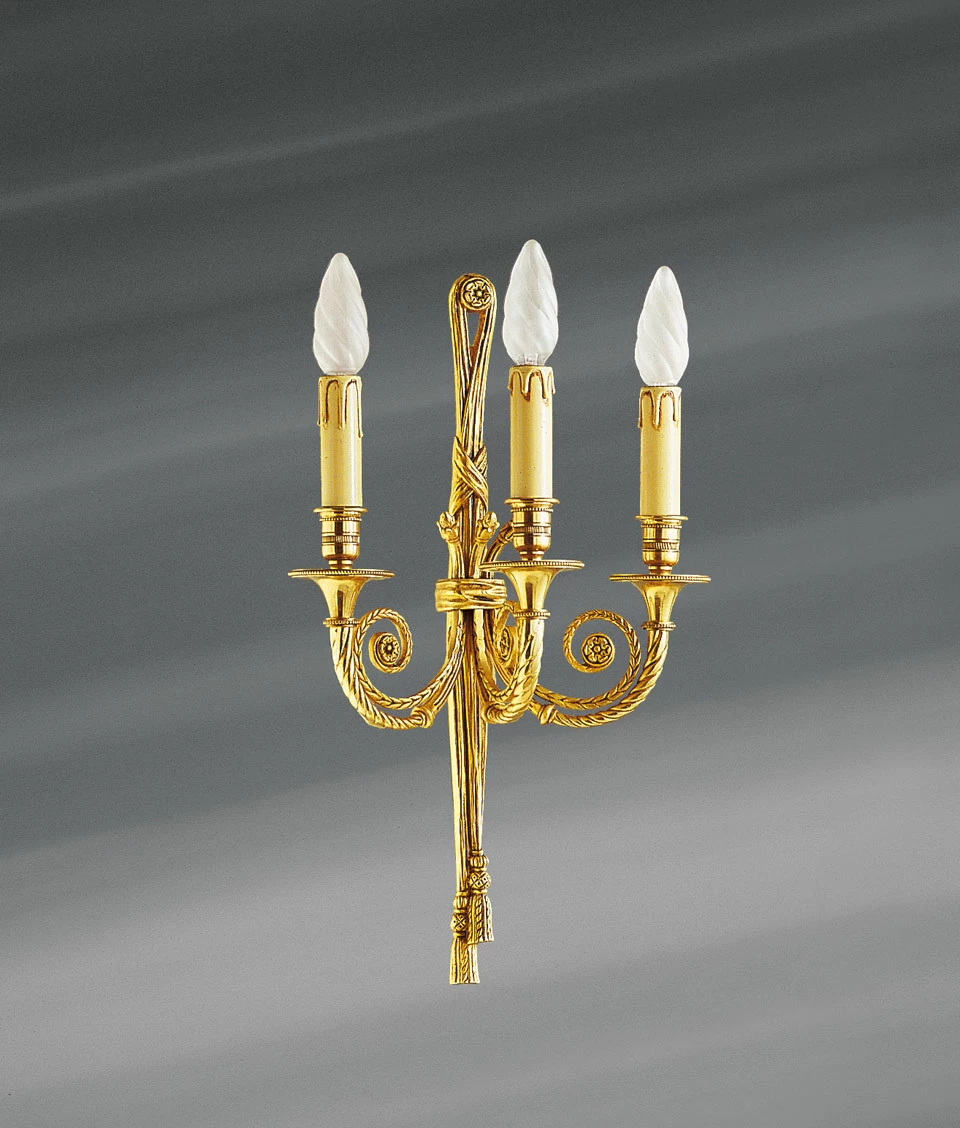 Merveilleusement travaillée, cette applique Louis XVI en bronze massif, finie en vieil or, arbore ses trois bougeoirs avec une élégance extrême. Ses bras tressés portant lumière et son corps drapé et festonné, terminé par deux pompons au raffinement extrême, met en valeur le travail et le savoir faire exceptionnel des artisans de la maison Lucien Gau, fournisseur officiel des châteaux et monuments historiques français et des plus grands hôtels de ce monde. Notons que la finesse du décors se loge jusque dans le bouton de fixation de l’applique, délicatement entouré d’un cordon drapé, bouton que l’on retrouve à la fin des fines tresses qui suivent les bras des lumières. Les éléments décoratifs du style Louis XVI sont donc bien là avec les festons, drapés et les boutons floraux qui terminent les tresses. Les bobèches et pieds des bougeoirs reprennent quand à eux les références classiques de l’antiquité caractérisant aussi le style Louis XVI. Cette applique existe également en deux lumières visible sous la référence 16060048.