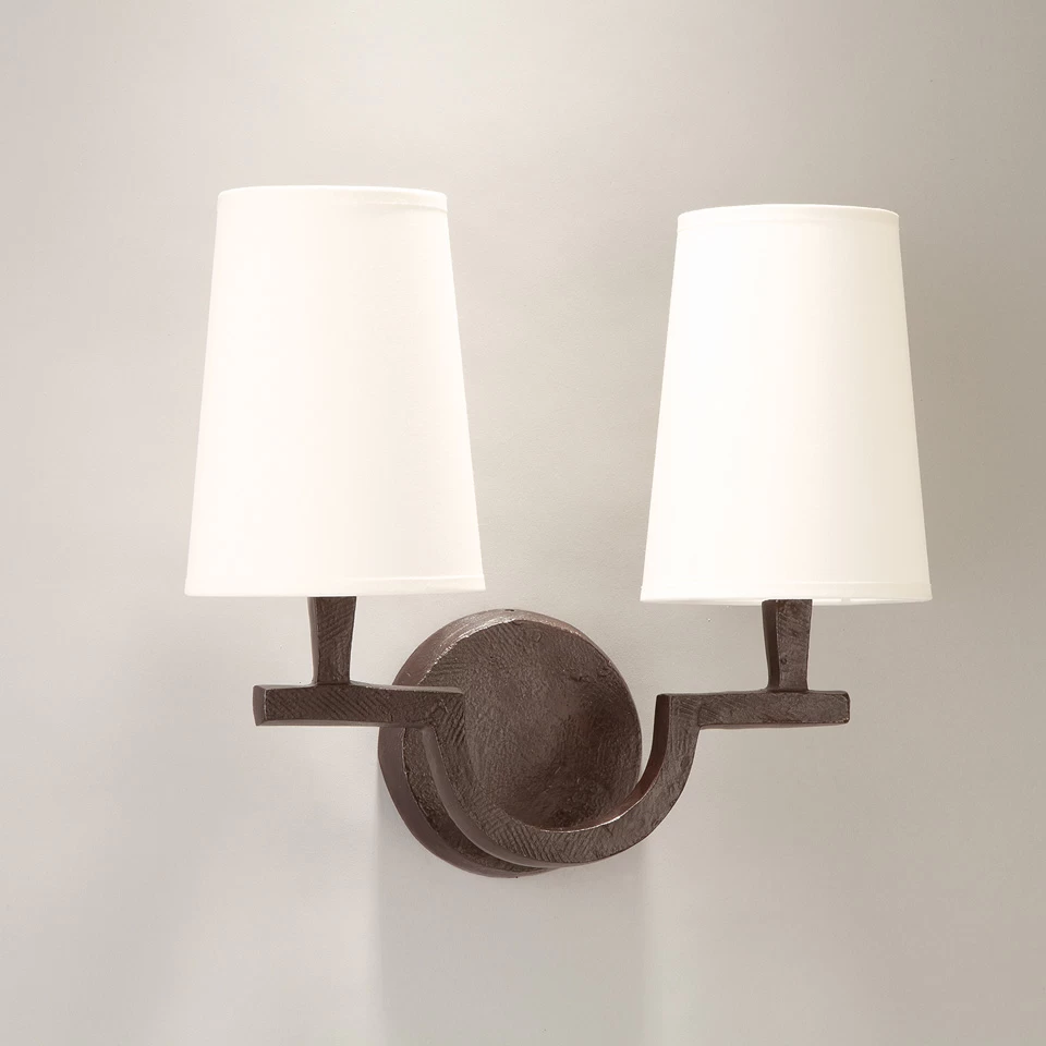 Perceval est une belle applique 2 lumières, dont les bras forme un motif ethnique réalisé dans un bronze massif à la finition noire patiné avec deux abat-jour coniques blancs. Un support mural rond épousant la forme des bras donne un parfait équilibre à ce modèle double. Le bronzier Augustin Granet utilise des techniques de moulages issues de l’industrie qui apporte irrégularités et force à la matière. Ce savoir-faire associé à un design toujours élégant et à la noblesse du bronze nous offrent une collection de luminaires raffinés, fait pour sublimer un bel intérieur. Par défaut, ce luminaire est livré avec l’abat-jour proposé sur cette image mais le tissu peut être choisi dans le nuancier visible en photo complémentaire sur cette page, choix à préciser dans les informations spéciales de votre formulaire de commande. Cette applique est visible en nickel satiné sous la référence 17090319 et en doré sous la référence 17090320.