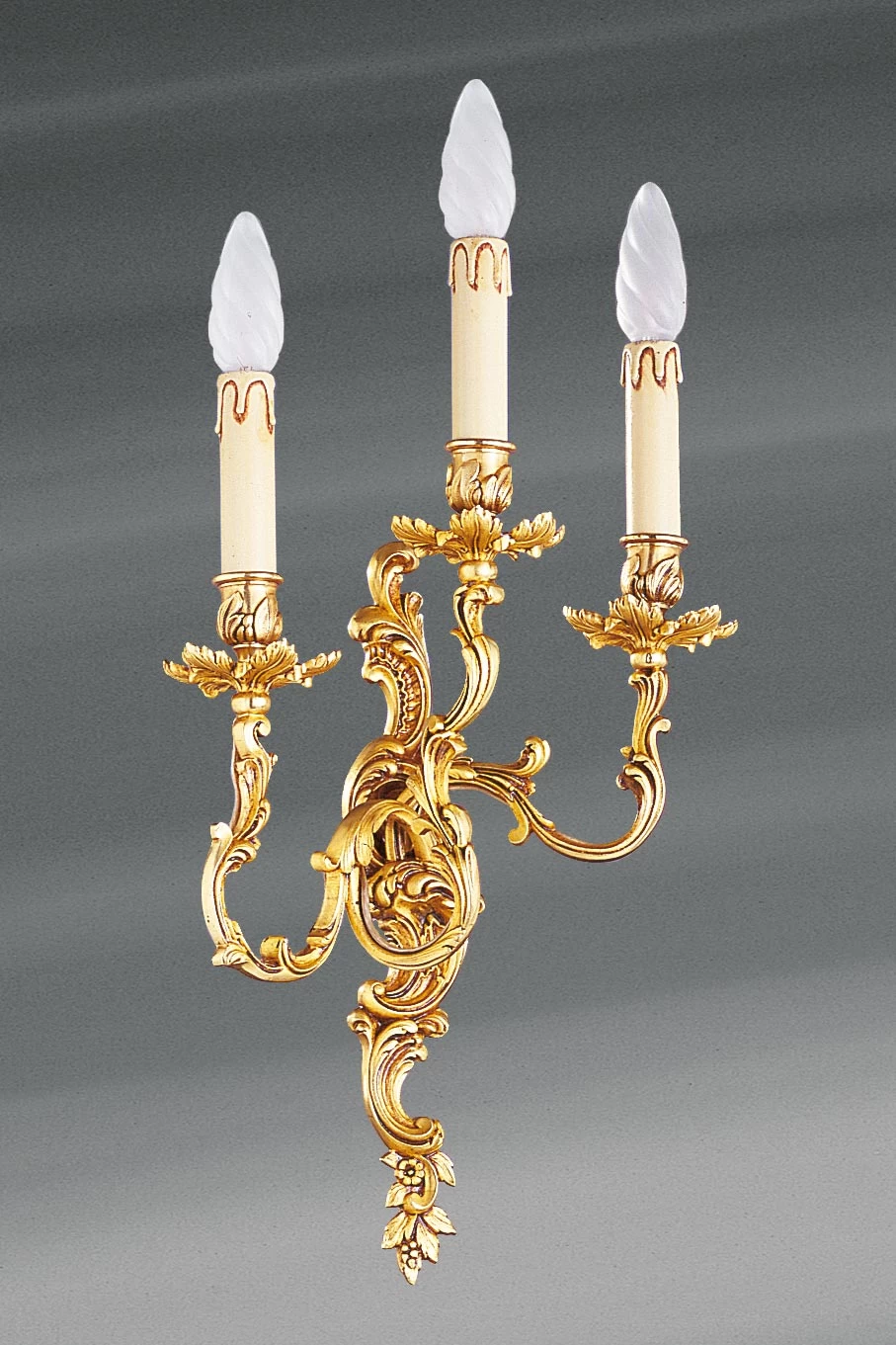 Munie de trois bougeoirs, cette applique murale en bronze Louis XV est formée d’un support mural sculpté et décoré d’un motif en feuilles recourbées. Ce support soutient trois branches recourbées délicieusement travaillées, portant bougeoir à leur extrémité et décorées de façon assortie. Les bassins, coupelles placées à la base des bougeoirs, sont sculptés en feuilles évasées. La réalisation, d’une qualité exemplaire, est effectuée selon les méthodes les plus traditionnelles, en France, dans les ateliers de Lucien Gau. Il existe dans la même collection plusieurs appliques murales Louis XV, à trois lumières (références 12020228 et 12020254), à deux lumières (références 12020230, 12020247, 12020255 et 12020258), à une lumière (12020259, 12020281) ainsi qu’un ravissant modèle à deux lumières avec miroir ovale (12020278).