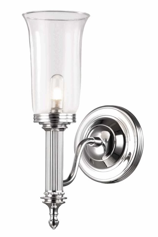 Cette applique murale de salle de bain en flambeau cannelé et verre transparent, nommée Carroll 2, s’appuie sur un support rond. A son centre, est fixé un court bras en tige, raccordé à la partie inférieure du corps principal de l’applique. Celui-ci est dessiné en flambeau strié de fines cannelures, et décoré à son extrémité inférieure d’une boule surmontée de deux petites corniches. La verrerie, dessinée en forme de vase profond, est réalisée en verre transparent. Cette applique est étanche IP44, l’ampoule est protégée par une seconde enveloppe en verre transparent. Elle est réalisée en laiton massif, sur lequel est appliqué une épaisse couche de chrome. La fabrication, impeccable, est effectuée dans les ateliers de la société Elstead en Angleterre. Dans la collection Carroll pour salle de bain, on trouve quatre appliques, qui ont toutes la même partie métallique, mais des verreries de formes différentes: transparente en forme de vase (12110117), dépolie en forme de flamme (12110118), dépolie en forme de boule (12110119), et transparente cannelée (12110120).