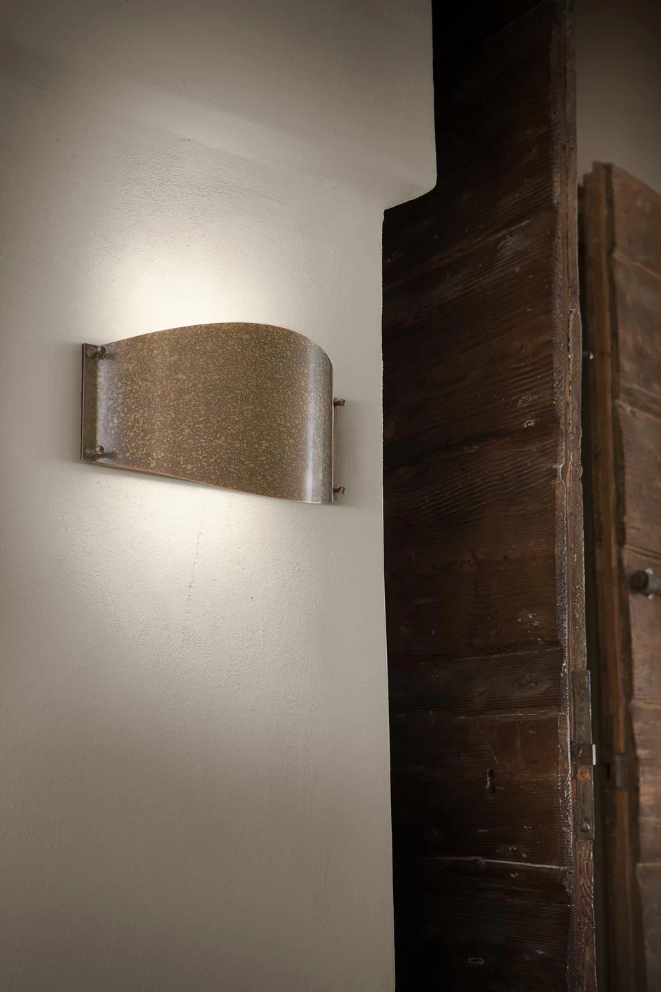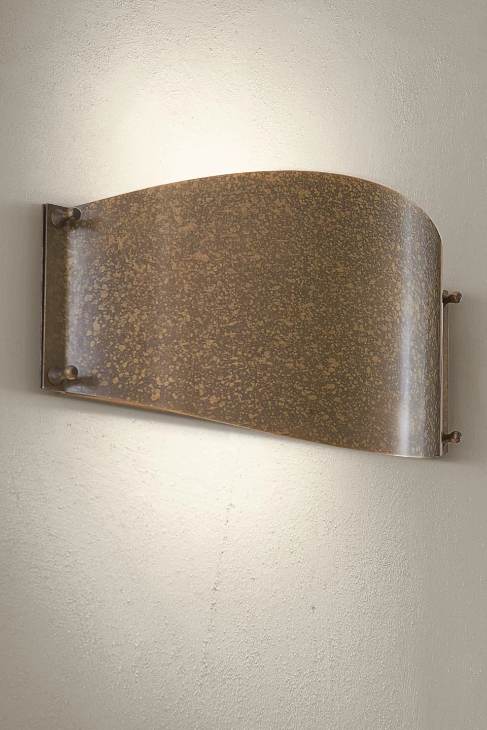 Cette petite applique de section ovale est réalisée en laiton patiné vieilli. Le travail de la matière accompli par les artisans d’Aldo Bernardi se traduit par une qualité visuelle tout à fait exceptionnelle, que des réalisations de moindre facture ne peuvent égaler. Une feuille de laiton découpée dans une forme ovale et réduite à ses deux extrémités par une découpe verticale est formée sur une portion de cylindre et rivetée sur une plaque murale rectangulaire du même matériau. Deux diffuseur en méthacrylate sont insérés à l’intérieur de la forme ainsi constituée, garantissant une qualité d’éclairage impeccable. Avec une profondeur de 10cm seulement, cette applique est parfaite pour une pièce de circulation (couloir, entrée) où elle ne gêne pas le passage. Cette lampe s’équipe d’une ampoule à économie d’énergie très facile à trouver en grande surface.