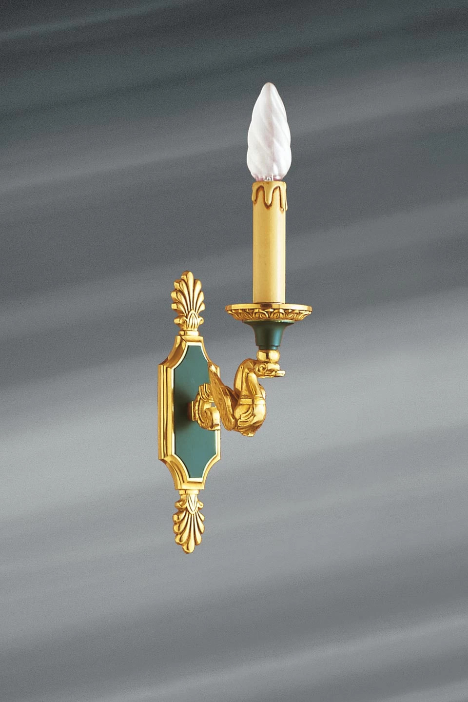Pure et dĂ©licate cette applique de style Empire, en bronze massif Ă la finition or vif et vert Empire. Son unique bougie est portĂ©e par un cygne triomphant, fixĂ© Ă la partie centrale et murale de l’applique. Le cadre de l’applique et la bobèche tout deux laquĂ©s vert mettent en relief les parties moulĂ©es du dĂ©cor finis en or vif. Cet ensemble bĂ©nĂ©ficie d’une technique de moulage au sable unique qui garantie la qualitĂ© et la finesse de son dĂ©cor. Les peintures et finitions de cette applique sont exĂ©cutĂ©es manuellement par les maĂ®tres artisans de la maison Lucien Gau, bronzier d’Art depuis 1860. Dans le mĂŞme esprit une applique Ă deux lumières est visible sous la rĂ©fĂ©rence 16060114 et une applique Ă trois lumières l’est sous la rĂ©fĂ©rence 16060109, tout comme un lustre Ă sept lumières sous la rĂ©fĂ©rence 10600106.