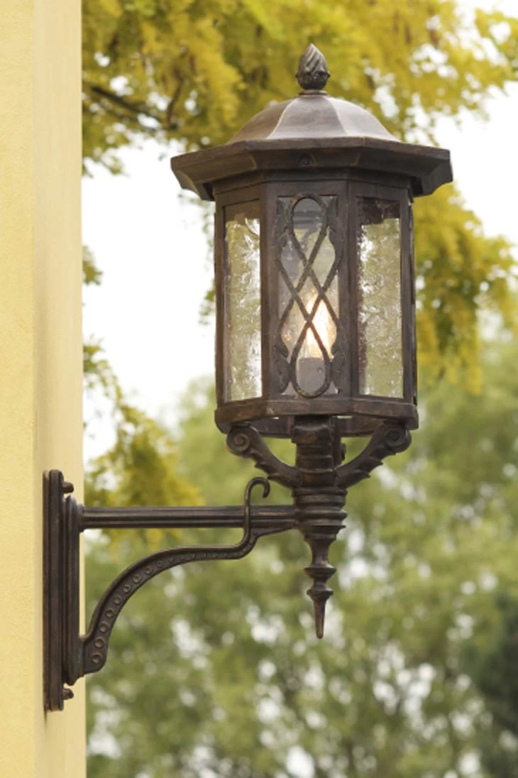 Cette applique sur bras en fer forgé pour l’extérieur est idéale pour éclairer avec distinction les murs extérieurs de votre demeure. Un bras solide et décoré d’un étai arrondi s’appuie sur un support mural rectangulaire. Ornée d’une partie inférieure en pointe, la lanterne est munie d’une verrerie dépolie à six faces. Certaines faces sont ornées d’une grille en fer forgé, aux motifs arrondis et entrelacés. La lanterne est surmontée d’un toit à facettes arrondies et décorée à son sommet par un motif en pomme de pin. La construction est particulièrement robuste, en fer forgé patiné. Ce luminaire est fabriqué à la main dans les ateliers et forges de la société Robers en Allemagne. Nous conseillons l’utilisation d’un ampoule décorative, telle que celle que nous présentons sous la référence 11020153. Dans cette collection, on trouve une lampe à fixer (12090024), un lampadaire (12090025), une applique simple (12090026) et une applique sur potence (12090027).