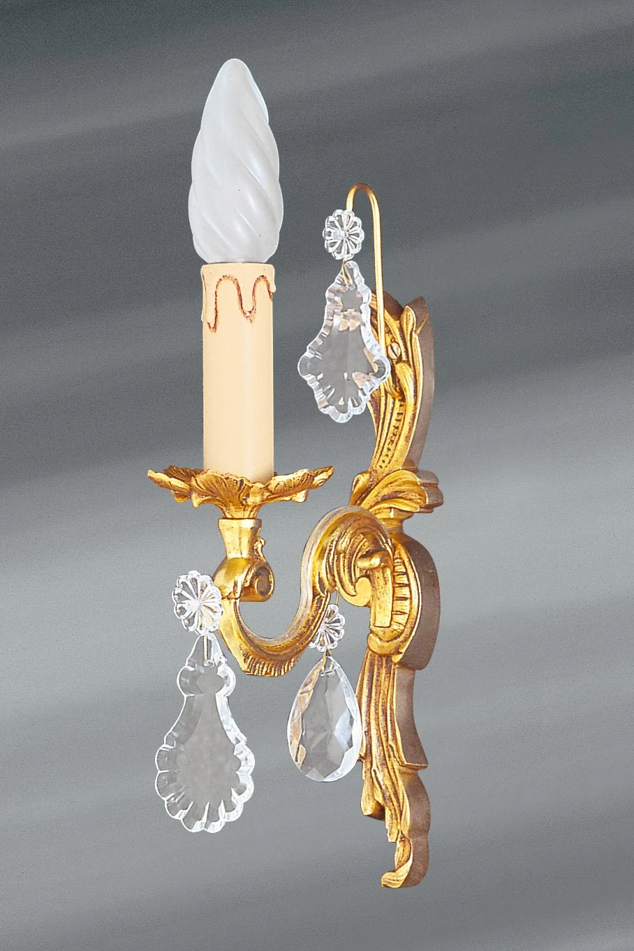 Exquise, cette petite applique Louis XV en bronze vieil or et cristal de bohème ne mesure que 8cm de large – un avantage indéniable lorsque la place est comptée. Un support en bronze massif décoré de feuilles d’acanthe élégamment incurvées se prolonge dans sa partie centrale par un bras en double volute aux motifs ornementaux assortis. Le bougeoir est placé au dessus d’un petit pied délicatement cintré, le bassin (coupelle située à la base du bougeoir) prend la forme de plusieurs feuilles écartées. Quelques pampilles en cristal de bohème apportent un ravissant complément esthétique à cette applique au style rigoureux. La fabrication, en bronze massif moulé au sable, travaillé, fini et patiné à la main, est exemplaire. Il existe une applique double Louis XV assortie, visible sous la référence 12020209.