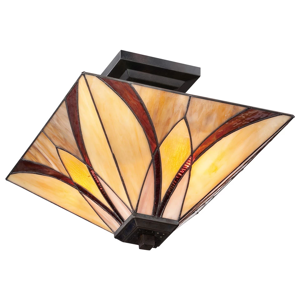 Joli plafonnier de forme pyramidale Asheville Tiffany Ă l’abat-jour de verre et format carrĂ© aux motifs gĂ©omĂ©triques simples, d’inspiration Art Nouveau, avec des teintes chaudes et un support finition bronze. Le support de plafond est carrĂ© et l’abat-jour est fixĂ© sur une courte tige, celui-ci est composĂ© de 44 piĂšces de verre teintĂ© orangĂ© et rouge assemblĂ©es Ă la main. L’abat-jour, selon la tradition de fabrication des lampes Tiffany, est composĂ© de piĂšces de verre coupĂ©es et limĂ©es Ă la main suivant la forme d’un gabarit puis assemblĂ©es entre elles grĂące un joint en Ă©tain dans un moule de fibre de verre, qui lui donne sa forme finale.