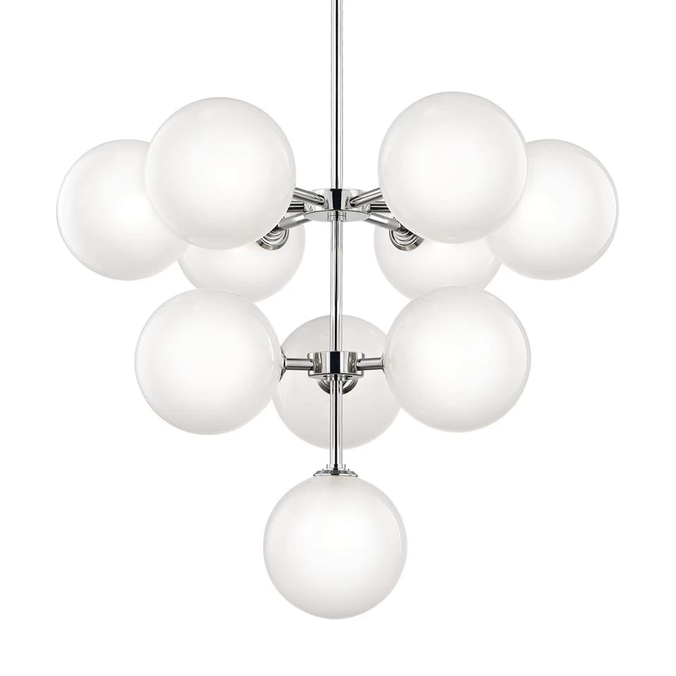 Ashleigh est un charmant mélange de classique et de rétro, pour un beau lustre 10 lumières. Le luminaire est composé d’une tige verticale en acier, sur laquelle sont fixés deux cylindres l’un au-dessus de l’autre, avec une finition nickel poli du métal qui confère cette tonalité argentée. Sur ceux-ci sont fixés en étoile les bras des diffuseurs, en forme de sphères de verre. Le traitement à l’acide de l’intérieur du verre donne cette texture satinée et mate, et demeure transparente à l’extérieur. Les différentes boules sont arrangées de manière à former une pyramide inversée, qui créé un effet d’empilement des sphères lorsque le luminaire est regardé d’en-dessous. Plusieurs marques sont incluses dans la gamme de luminaire de la maison américaine Hudson Valley, marquée par sa diversité de style.