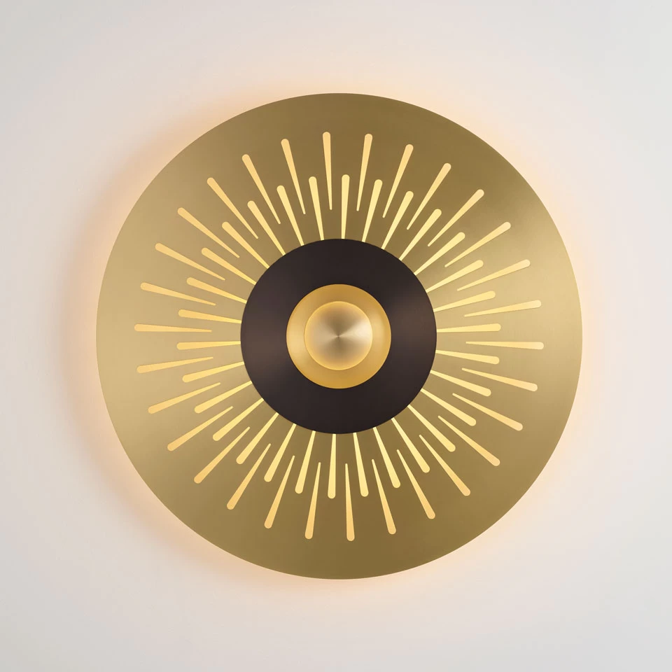 Le modèle d’applique Stella explore toute la dimension solaire de la collection Atmos dont elle est issue, avec son plateau rond de laiton percée de rayons qui créé l’effet d’un petit soleil, et son jeu de superpositions de finitions tantôt laiton satiné tantôt graphite des différentes parties du modèle, et équipé d’éclairage LED intégré. Stella est composée d’un large disque de laiton massif percé de deux rangées en quinconce de traits qui rayonnent autour d’une platine de laiton graphite satiné et d’un anneau de laiton satiné, complété par un médaillon lisse doré au centre. Le modèle produit une lumière chaleureuse et intime idéale pour éclairer une tête de lit ou encore pour une ambiance feutrée dans un séjour.