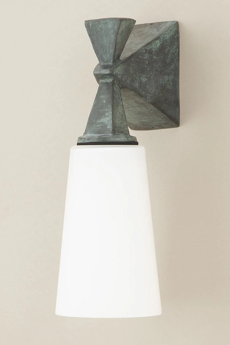 Petite applique classique d’extérieur ou de salle de bain Axel en forme de sablier en bronze avec une belle patine vert-de-gris et un diffuseur conique en verre opale blanc. Le modèle est doté d’un support mural en pyramide à 4 angles, surmonté d’un sablier vertical sur lequel est fixé l’abat-jour légèrement conique en verre blanc. Le bronze massif dont l’applique est faite est travaillé d’une belle finition verte qui donne cette patine vert-de gris au modèle, et magnifie la puissance du matériau tout en lui laissant un léger aspect rugueux, avec des irrégularités qui font la dimension unique du modèle.