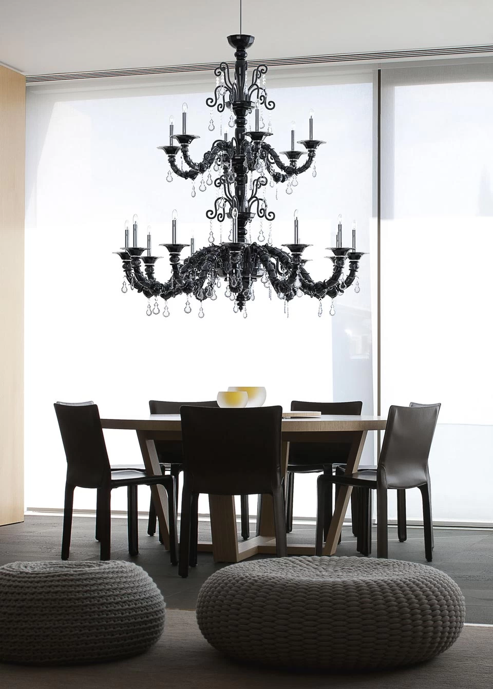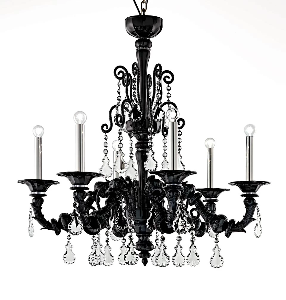 Superbe lustre Baikal 6 lumières modèle contemporain dont le design emprunte à la forme classique des chandeliers vénitiens, doté d’une structure en cristal de Venise noir, de fourreaux en chrome poli et de pampilles en cristal transparent. Le lustre est composé de chandelles droites finition chrome poli, sur bras en col de cygne qui se déploient depuis le vase central. L’ensemble est richement décoré et finement sculpté, des bassins en corolle ouverte, en passant par les volutes qui viennent habiller le corps principal comme de délicates tiges de fleurs, ou encore les pampilles de cristal transparent qui parsèment le lustre. Le modèle est un ouvrage de la maison Barovier & Toso, née de la fusion de deux familles de verriers vénitiens, et aujourd’hui réputés comme maîtres incontestés du travail du verre de Murano.