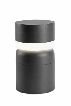 Courte et discrète, cette balise d’extérieur faite pour éclairer votre jardin ou votre allée est équipée de protection IP54. Evoquant la forme d’un pilier compacté sur lui-même, la balise est composée d’un cylindre d’aluminium gris sombre surmonté d’un mince diffuseur en forme de disque en polycarbonate opale, lui-même surmonté d’un chapeau d’aluminium plat. L’ensemble est passe-partout, élégant et sobre.