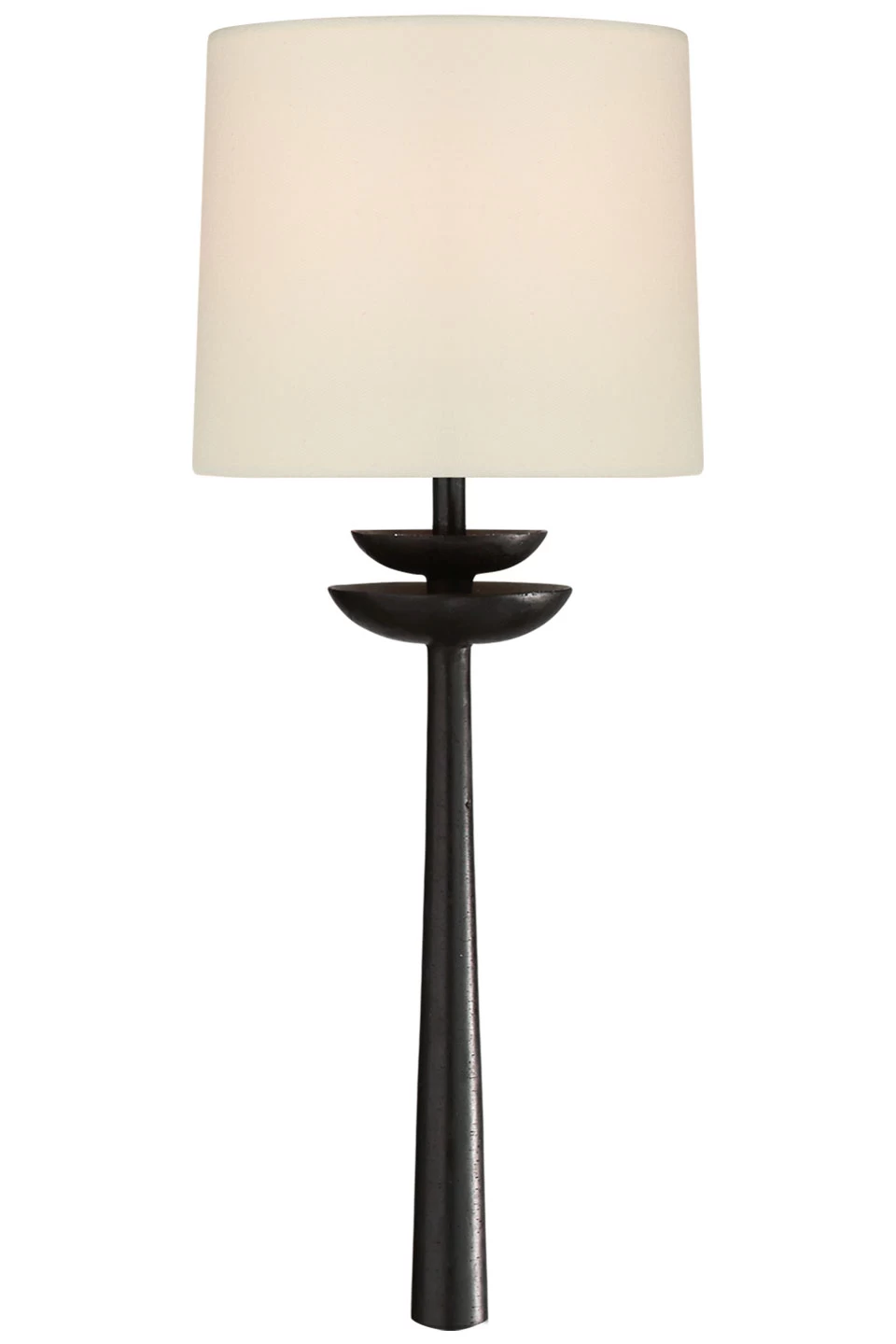 Laissez-vous séduire par la ligne végétale de l’applique contemporaine Beaumont noire, avec son support en métal patiné et son abat-jour en lin blanc. Le modèle est composé d’un support mural rond masqué par l’abat-jour, et d’un support vertical en épine de métal agrémentée de deux pétales stylisées qui précèdent le demi abat-jour aux belles proportions en lin blanc. Remarquez la finition noire patinée qui donne cette texture sombre et authentique au modèle.