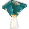 Joli plafonnier en céramique blanche de la collection Belluno qui amène une ambiance délicieusement désuète en maniant une esthétique rétro qui rappelle l’ambiance de nos anciennes longères de campagne. Les bords de l’abat-jour arrondi suivent une jolie ondulation liserée de bleu, et l’intérieur de celui-ci est décoré de petites fleurs bleues peintes à la main. L’abat-jour est surmonté d’une pièce de métal dorée qui fait la jointure avec le support de plafond rond en céramique lui aussi décoré d’un liseré bleu. La maison italienne Ferroluce en activité depuis 1982 fabrique ses luminaires exclusivement en Italie, aux mains des meilleurs artisans céramistes.