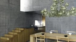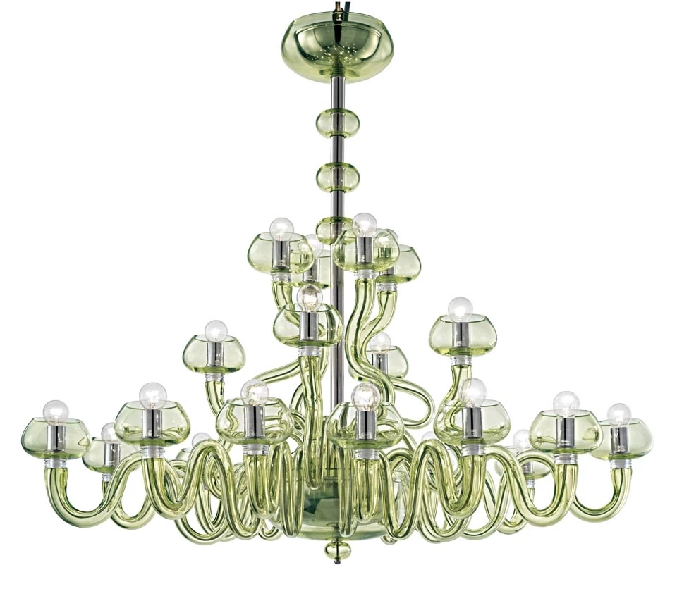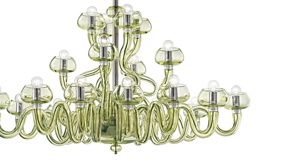 Superbe lustre Bissa Bossa 20 lumières qui associe le style de chandelier vénitien classique à la modernité avec sa structure en métal chromé et ses branches en cristal de Venise vert citron. Le modèle, dont le nom est une évocation directe de l’inspiration reptilienne du design, puisque bossa est le mot vénitien pour serpent, est composé d’une multitude de bras en cristal couleur citron vert qui ondulent depuis un enfilage circulaire lui aussi en cristal. Les bras sont surmontés chacun d’un bassin en coupole et d’un fourreau en métal finition chrome poli, tout comme la tige central qui fixe le luminaire au plafond. Certains des bras serpentent verticalement, évoquant les dresseurs de serpent qui les enchantent à l’aide de leur flûte, ce qui créé une ambiance hypnotique et magique, soulignée par la couleur verte du cristal. Les courbes harmonieuses et l’impeccable ouvrage du cristal sont la marque de la maison vénitienne Barovier & Toso, née de la fusion de deux familles à l’histoire pluriséculaire dans le milieu du verre de Murano, et aujourd’hui maîtresse incontestée dans ce domaine.