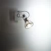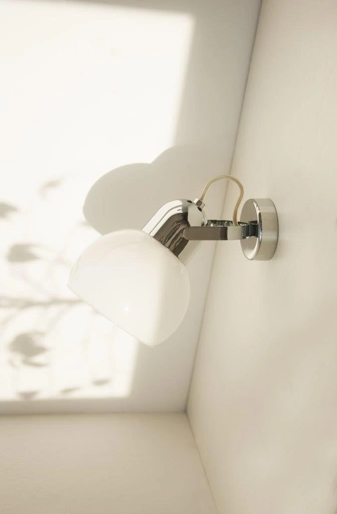 La série Boogie propose avec ce modèle un spot compact et rétro, qui joue avec le contraste des matières et couleurs, ici l’abat-jour en bulle de verre opale blanc, coupé, est monté sur un cache-douille et un U en métal qui permet l’orientation du spot, sur une platine de mur en métal. L’ensemble de la structure est en finition chromé, qui contraste avec le blanc du verre. Le diffuseur opale blanc offre une lumière diffuse, pâle et homogène.