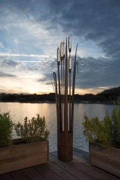 Le bouquet de joncs est composé de tiges et de fines feuilles en fer forgé finition rouille et de fleurs de joncs en verre fait à la main, en verre transparent avec un cœur en verre antique bullé. Les fleurs sont illuminées par un éclairage LED invisible et logé dans la tige. Le bouquet de joncs peut se poser sur une terrasse avec un câblege par le sol ou mis en terre. Des joncs simples disponibles en 3 tailles sont visibles sous la référence 19010018. L’entreprise familiale allemande Robers développe des produits intemporels et de qualité depuis 1964. Réputée pour l’authenticité de ses produits fabriqués dans le respect des traditions artisanales, elle utilise des matériaux comme l’aluminium, le bronze ou encore la fonte, et propose une large gamme de finitions.