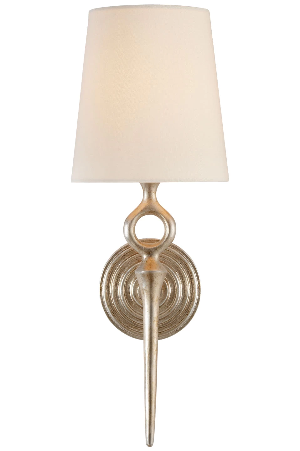 Une Ă©lĂ©gance indĂ©niable pour cette applique Bristol finition feuille d’argent de style contemporain, avec son support de mĂ©tal moulĂ© et son abat-jour conique en lin blanc. La finition feuille d’argent est adoucie par des Ă©clats dorĂ©s, composĂ© d’un support mural rond creusĂ© de cercles concentriques, et d’un bras court horizontal qui supporte le bras principale, moulĂ© en pointe sur la partie basse, d’un anneau, et coiffĂ© de l’abat-jour conique en lin blanc. Le modèle se prĂŞte Ă merveille Ă une pose en sĂ©rie le long d’un couloir, tant dans un environnement contemporain que dans une maison plus classique. Ce luminaire est signĂ© AERIN, petite fille d’EstĂ©e Lauder, qui nous propose un univers fait de l’esprit chic et Ă©lĂ©gant des Hamptons, avec des influences me?diterrane?ennes.