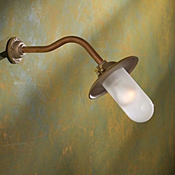 L’applique présentée sur cette page est coudée à 45°. Elle est fabriquée en cuivre rouge, et munie d’un verre sablé.
