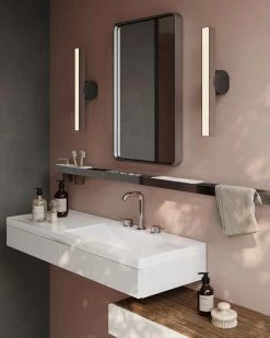 L’applique Calée V2 pour la salle de bain est très minimaliste et équipée d’une éclairage LED. Elle est composée d’un bouton graphite fixé au mur par sa tranche qui soutient une réglette en nickel satiné contenant la source de lumière. Entre les deux, c’est l’équilibre parfait. Cette applique originale produit un éclairage vers l’avant agréablement adouci par le diffuseur en polycarbonate blanc. La protection IP44 permet son installation en toute sécurité dans une salle de bain.