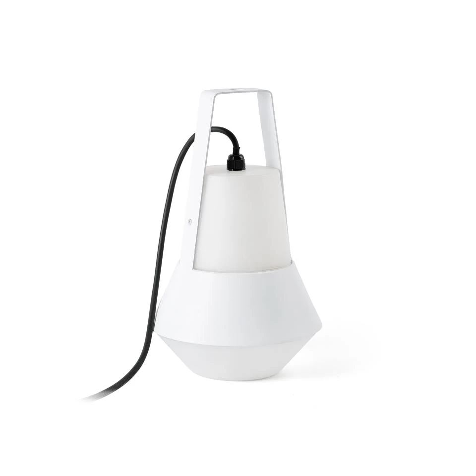 Très jolie lampe d’extérieur baladeuse en forme de lanterne design peut se poser ou se suspendre. Le modèle ici en finition blanche est fait d’une pièce d’aluminium blanc qui cintre le diffuseur en polyéthylène blanc, surmonté d’une poignée qui permet de suspendre la lanterne autant que de la poser sur une table. Elle est pourvue de la norme de protection IP54 qui la rend tout à fait apte à une utilisation en extérieur.