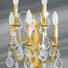 Doré, ce chandelier Louis XV est muni de trois bougeoirs. Le pied, en bronze massif évasé, est surmonté d’un élément à deux renflements, puis d’un hémisphère portant les trois branches de ce luminaire. L’ensemble est décoré de feuilles enroulées, moulées puis ciselées à la main. De l’hémisphère central s’élève également une fine tige terminée par un anneau d’éléments en volute et portant l’abat-jour. Cette lampe chandelier est réalisée en bronze massif patiné vieil or. La fabrication est effectuée par les artisans employés par Lucien Gau, en France. Il existe un modèle avec électrification et abat-jour, disponible sous la référence 12020236.