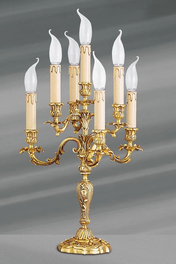 Ce magnifique chandelier girandole de style Louis XV a vocation à être posé sur une table ou une console. Un support de forme ronde délicatement sculpté se poursuit par un pied légèrement renflé, décoré de motifs en feuille d’acanthe. Le pied supporte six branches en volutes à l’ornement assorti, et se poursuit également, à son extrémité supérieure, par un bougeoir central. Les bassins (coupelles situées à la base des bougeoirs) sont faits de feuilles torsadées. Avec un diamètre de 38cm seulement, ce chandelier bougeoir peut prendre place sur une table de dîner. Sa forme générale est exquise, sa réalisation particulièrement soignée, de façon intégralement artisanale, en bronze massif. Il existe une applique à trois ou à cinq lumières assortie sous la référence 12020225.