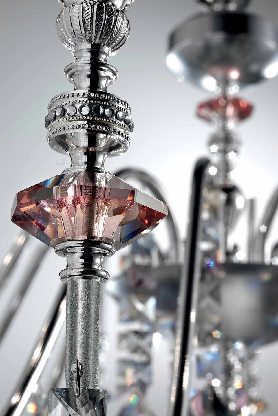 Superbe lustre au design unique, vous avez ici le lustre 8 lumières issue de la collection classique revisité Chic, faite d’élégance et d’attention au détail, avec sa structure recouverte de feuille d’argent, ses imitations de bougies et les pampilles de verre coloré qui parsèment le lustre. Celui-ci est composé de 8 bras en col de cygne qui jaillissent d’un enfilage central en simple bol métallique, chaque bras est surmonté d’un gros cristal tantôt transparent tantôt bleu taillé en diamant, d’une bobèche délicatement moulée de détails minutieux et d’une bougie métallique droite qui accueille l’ampoule. La partie centrale du lustre est décorée de deux gros cristaux, l’un rouge et l’autre bleu, ce qui fait écho à l’attraction du modèle, à savoir les dizaines de pampilles en cristal coloré dans des tons pastel et taillés en losange, qui habillent la partie inférieure du lustre et amènent un touche élégante et chaleureuse au luminaire. La maison italienne Masiero réalise un parfait mariage entre l’esthétique vénitienne classique et la créativité permise par les innovations technologiques, pour une collection élégante et pléthorique.