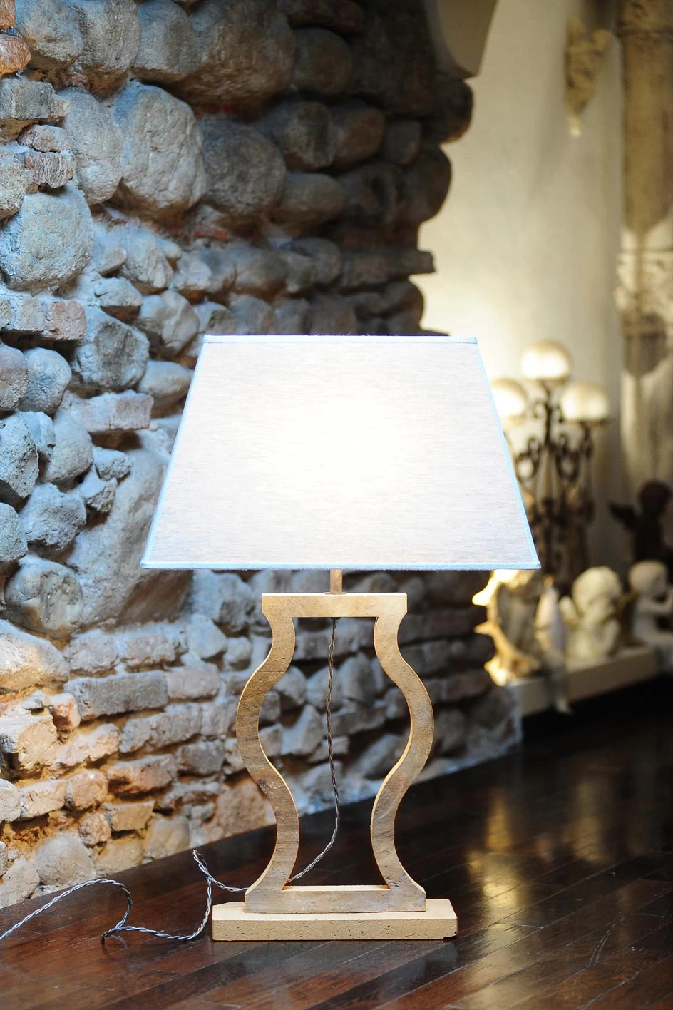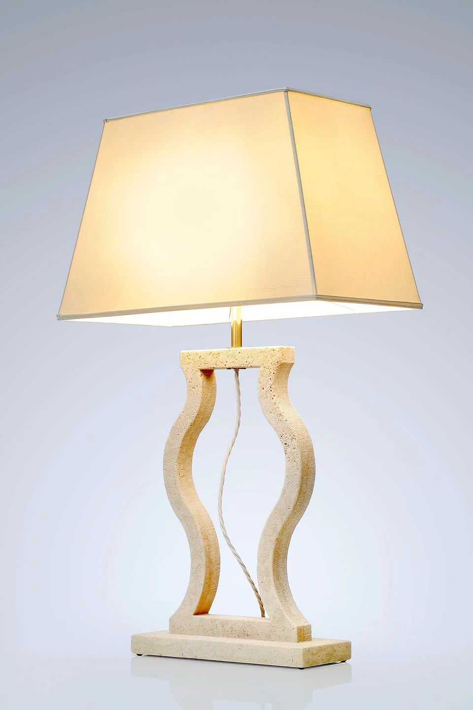 Classic moyen modèle est une lampe de table en marbre de couleur crème en forme d’amphore découpée dans du travertin. L’abat-jour de section rectangulaire est en taffetas crème intérieur blanc dont les bords sont soulignés d’un galon coordonné. La faible profondeur de son abat-jour permet de l’installer sur un meuble étroit. Le pied, vide en son milieu, est traversé par le cordon d’alimentation en tissu crème et c’est ce qui en fait toute son originalité. Les abat-jour, réalisés dans des tissus soigneusement sélectionnés, doublés et gansés contribuent également au raffinement de cette gamme. Elle se décline en trois collections: Classic, Contemporary et Deco. La collection Classic comprend également deux autres modèles de lampes 15070100 et 15070102, une applique 15070103, une suspension simple 15070104, une suspension double 15070105 et un lampadaire 15070106. Cette collection étant confectionnée entièrement à la main, de nombreuses personnalisations sont possibles, nous consulter.