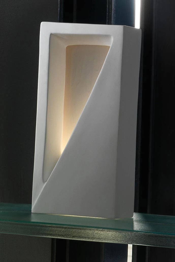 Crono est une très originale lampe de table rectangulaire blanche, réalisée en céramique brute, à l’aspect rugueux. L’ouverture triangulaire laisse passer la lumière produite par l’ampoule logée en son centre. Cette lampe est également disponible en finition lisse, blanc mat, visible sur les photos complémentaires en cliquant sur zoom. On peut également commander Crono en version applique, voir les options de commande ci-dessous. Elle se monte alors retournée à 180°, l’ouverture triangulaire étant alors vers le bas. Dans cette disposition, une ouverture aménagée au sommet fournit un éclairage complémentaire dirigé vers le plafond. Cette lampe applique murale rectangulaire est réalisée dans les ateliers de Stylnove Ceramiche, à Vicence en Italie. Du point de vue technique, elle s’équipe de toute ampoule standard 230V E27, conventionnelle ou à économie d’énergie.