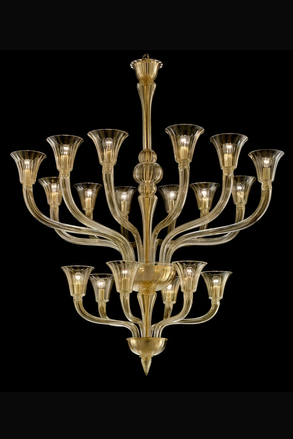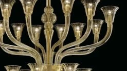 Un superbe lustre 18 lumières de la série Degas, sa beauté réside dans son design épuré: rien n’entrave l’appréciation des courbes harmonieuses du luminaire et la beauté de son cristal de Venise doré. Le lustre est composé de bras organisés sur deux niveaux marqués chacun par une coupole inversée. Les bras en cristal couleur or sont surmontés d’un bassin en trompette, à l’intérieur desquelles sont logées de courts fourreaux en métal finition or. L’inspiration florale et la teinte dorée amènent beaucoup de chaleur à cet élégant modèle, ouvrage issu des ateliers de la maison Barovier & Toso, dont l’incontestable réputation est construite sur la fusion du savoir-faire ancestral de deux familles vénitiennes, dans le domaine du travail du verre de Murano.