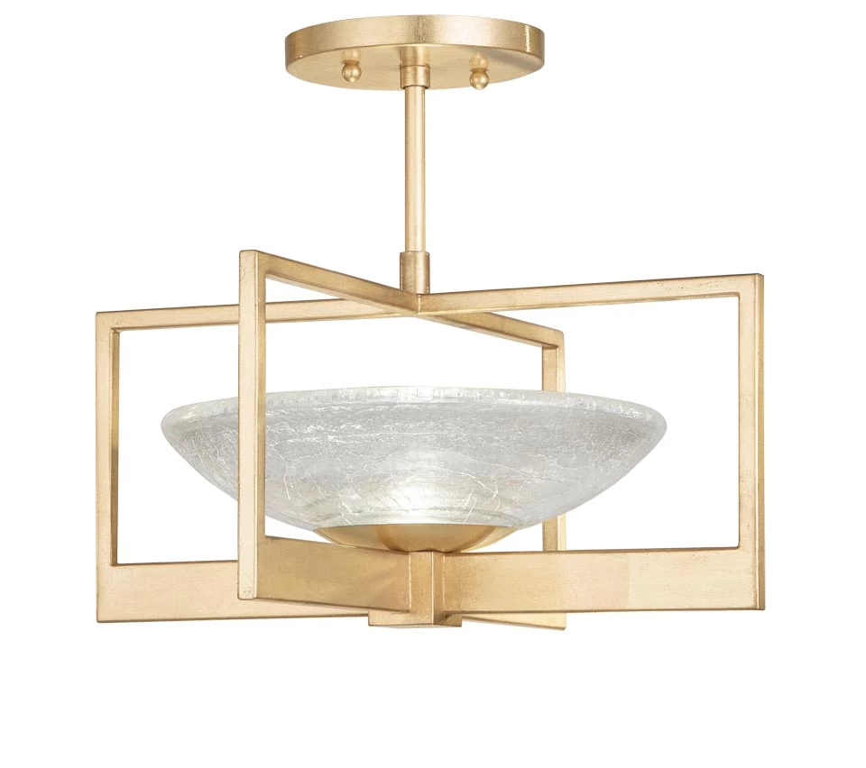 Joli plafonnier Art Déco de la collection Delphi, inspirée d’un univers antique, comme le suggère son nom. Le plafonnier est composé de deux cadres de métal rectangulaires finition feuille d’or, emboités l’un dans l’autre en croix, au centre duquel est logée une superbe coupelle de verre moulé à la main et laissé brut, avec des imperfections. La coupelle au design arrondi est placée sur un socle doré, et l’ensemble est fixé au plafond par une tige et un disque dorés. La tige de suspension peut être coupé en atelier à vos mesures.