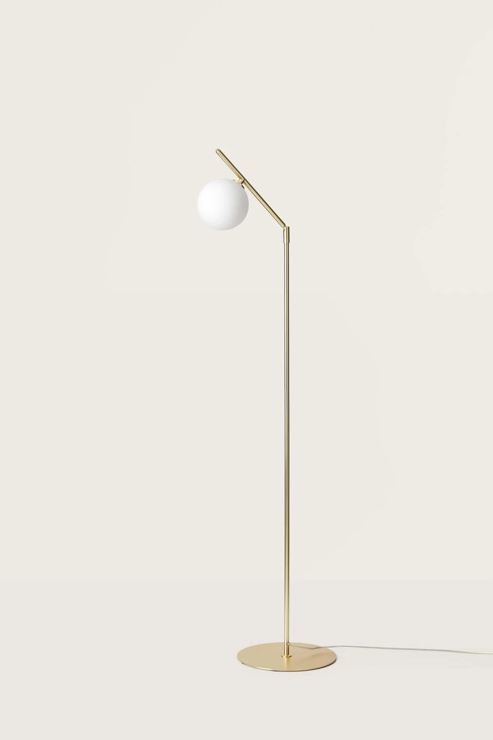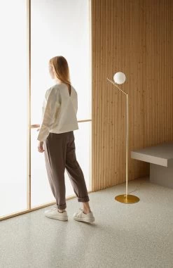 Une élégance presque rétro pour ce lampadaire Endo, avec sa boule de verre soufflé opale blanc sur une structure en laiton poli et son coude articulé qui permet l’ajustement du bras à 180°. Endo est doté d’un socle rond et d’un pied droit en laiton satiné, sur laquelle est fixé le diffuseur en sphère de verre opale, qui grâce à son ampoule LED diffuse une lumière homogène et intense. La maison espagnole Aromas, fondée à Valence dans les années 1980, produit d’élégants et intemporels luminaires dans un style contemporain affirmé, tout en travaillant à partir de matériaux et techniques traditionnels, tel le marbre, la céramique ou le bois.